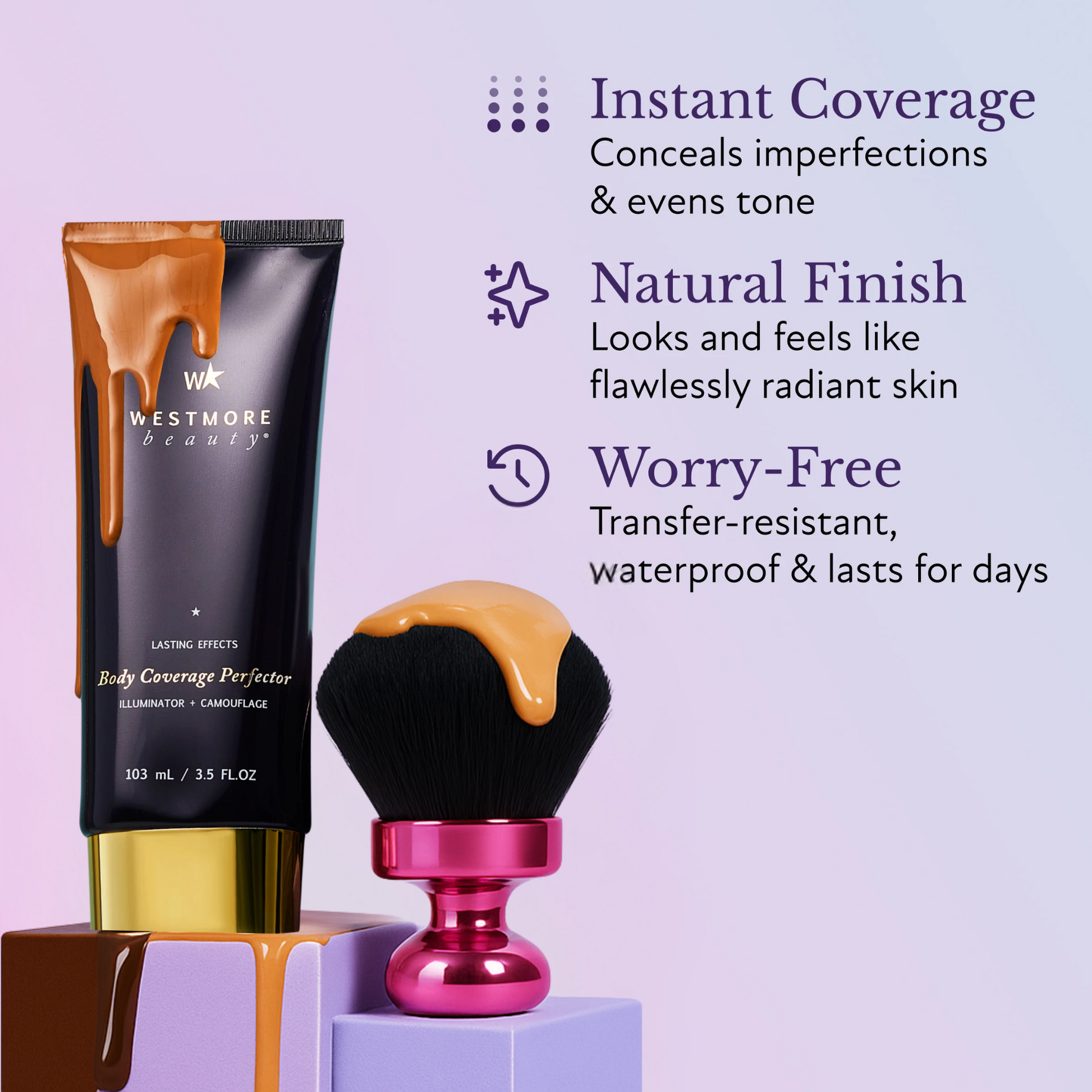Nuestro Body Coverage Perfector ofrece la cobertura ideal y una fácil difuminación para disimular las venas fácilmente. Para las venas azules, recomendamos aplicar 3 capas para lograr una cobertura completa y un acabado impecable. Su fórmula es resistente al agua, al sudor y a las manchas, para que puedas usarla sin preocupaciones durante todo el día.
