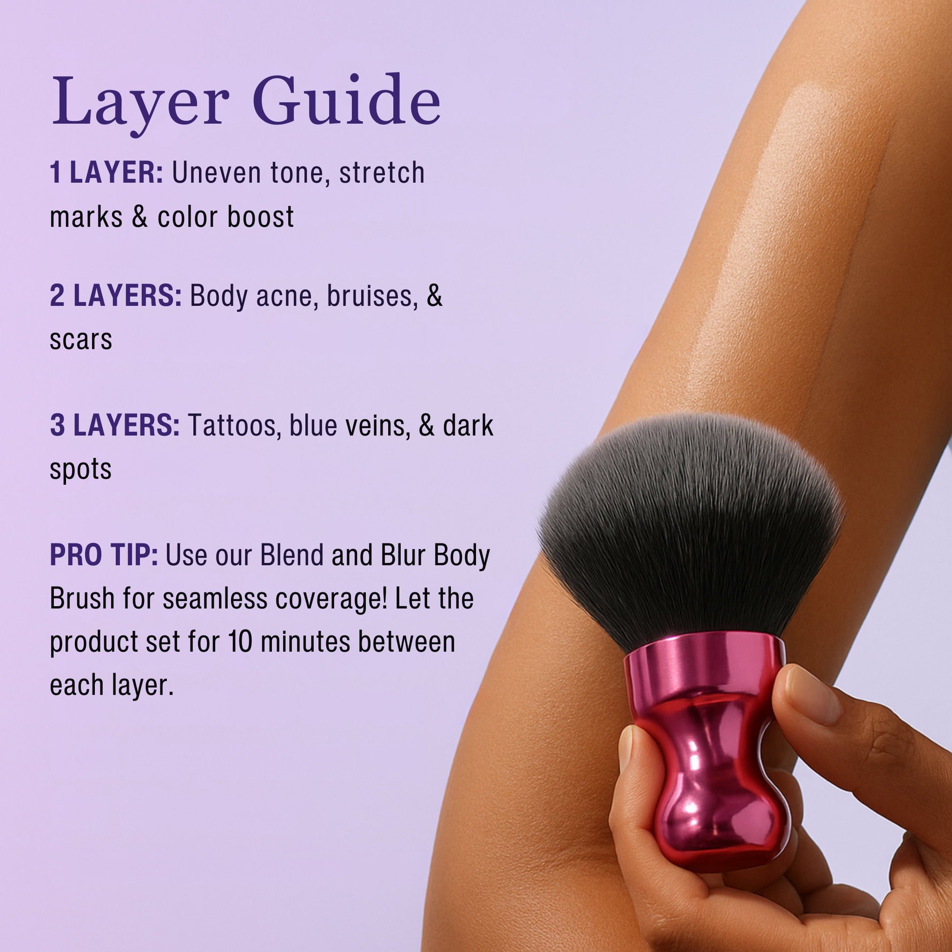 Body Coverage Perfector ofrece una cobertura modulable y duradera con un acabado natural que disimula perfectamente las cicatrices y unifica el tono de la piel. Para obtener mejores resultados, recomendamos aplicar de 2 a 3 capas para cubrir las cicatrices, según su gravedad. Para zonas de difícil acceso, utiliza nuestra brocha Blend and Blur Body Brush para una aplicación rápida y uniforme. Su fórmula es resistente al agua y no se transfiere, para una cobertura impecable durante todo el día.